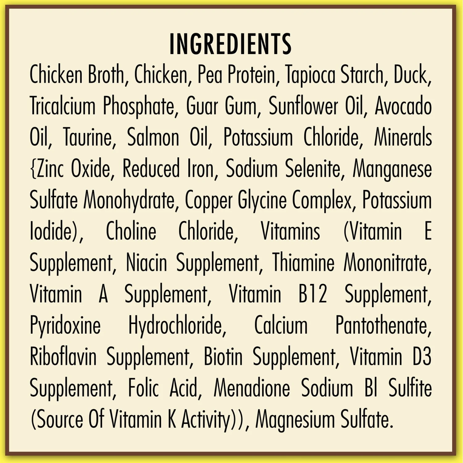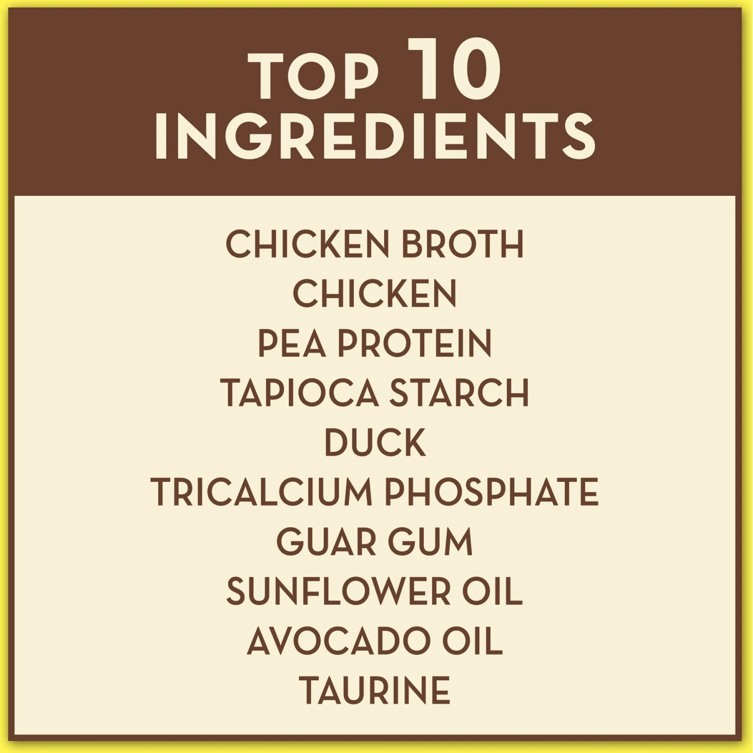 - Chicken and chicken broth are the top ingredients, plus duck for the animal-sourced protein your kitty thrives on.