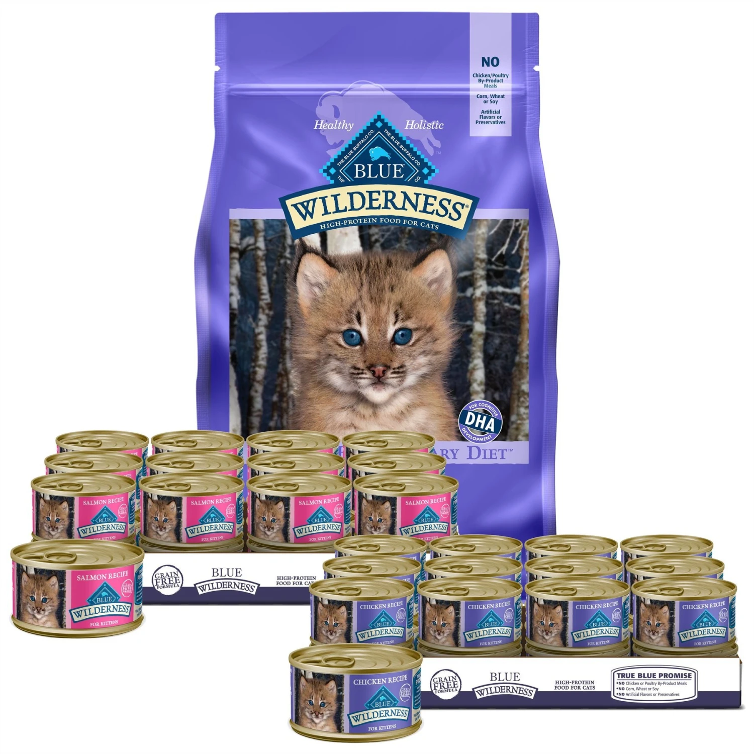 Blue Buffalo Wilderness Kitten Chicken Grain-Free Canned Cat Food, 3-oz, case of 24 — Stock up on supper for your sidekick with Blue Buffalo Wilderness High Protein Grain Free, Natural Kitten Pate Wet Cat Food. Purr-fect for your growing kitten, this irresistibly tasty wet food is made using only the finest naturally grain and gluten-free ingredients. It starts with high-protein chicken, packed with healthy fruits and veggies, then enhanced with vitamins and minerals. Formulated with DHA, an important fatty acid found in mother’s milk, this delicious pate-style food helps support your kitty companion’s brain, eye and cognitive development. The exclusively wholesome ingredients do not contain any grain, gluten, by-product meals, corn, wheat, soy, artificial flavors or preservatives.