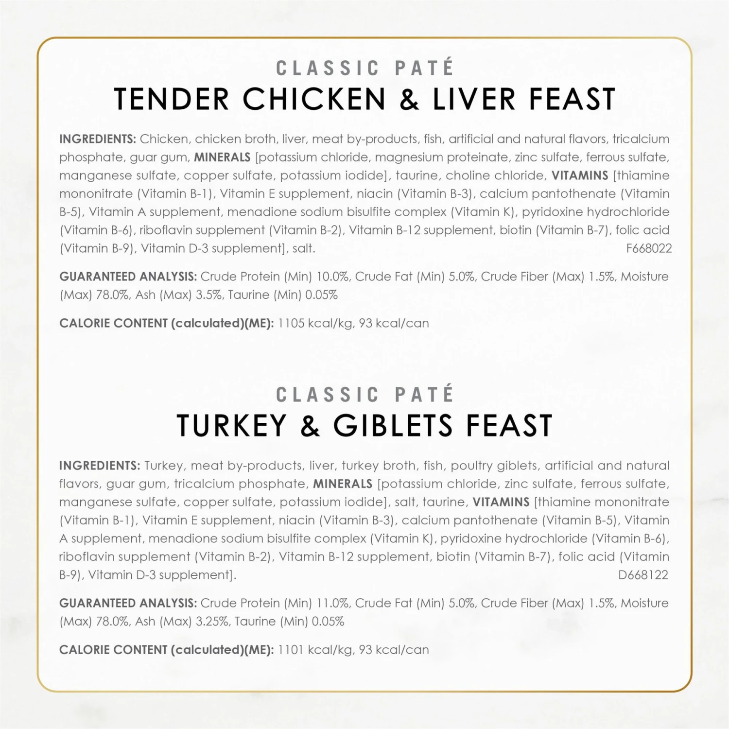 - This Classic Pate variety pack features real chicken, turkey or beef as the number one ingredient with a smooth pate texture.