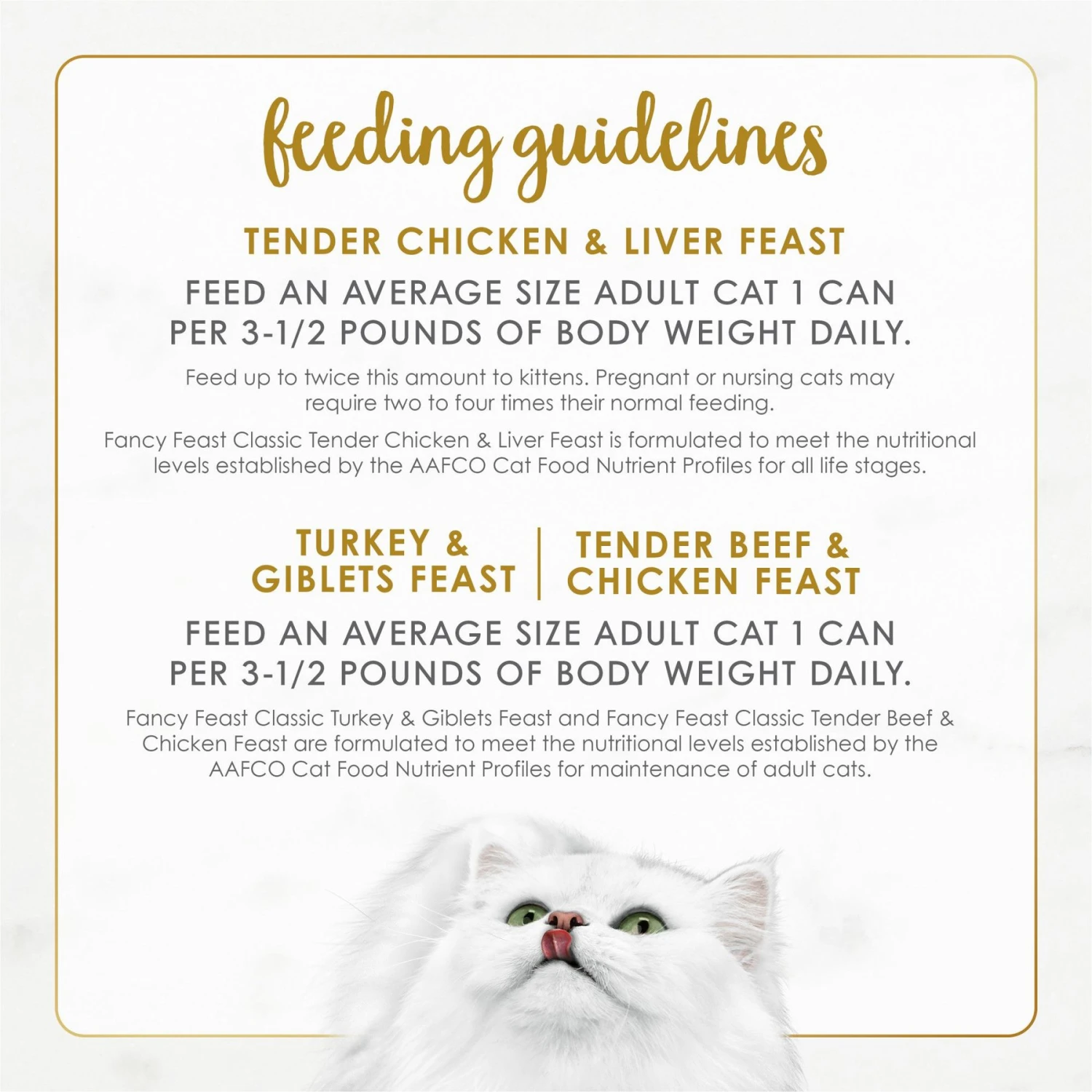 | Flavor | Seafood Feast, Savory Salmon Feast, Tender Beef & Chicken Feast, Variety Pack: Chicken & Beef, Variety Pack: Poultry & Beef 2, Chicken Feast, Variety Pack: Seafood, Salmon & Shrimp Feast, Chopped Grill Feast, Ocean Whitefish & Tuna Feast, Tender Beef & Liver Feast, Tender Liver & Chicken Feast, Turkey & Giblets Feast, Variety Pack, Cod, Sole & Shrimp Feast, Tender Beef Feast, Combine with Chicken Feast |
