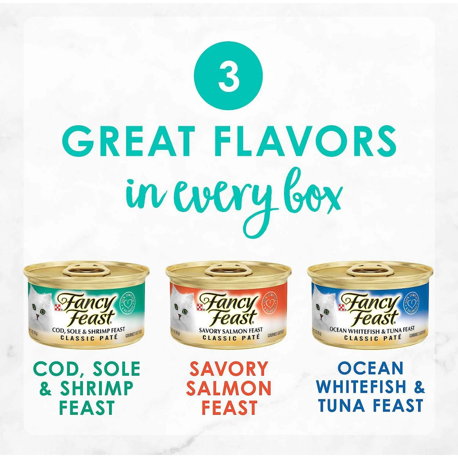Indulge your cat with savory seafood from Fancy Feast Classic Seafood Feast Variety Pack Canned Food + American Journey Landmark Broths Seafood Variety Pack Wet Cat Food Complement Pouches. The Seafood Feast variety pack features a finely ground and delightfully smooth pate texture that will fill your cat’s belly with joy. Added vitamins and minerals offer complete and balanced nutrition, making every mealtime a nutritious and delicious occasion. Landmark Broths are a tasty, flavor-boosting topper purr-fect for everyday meals or as a special, satisfying treat. No matter how you serve them, your cat is bound to love the craveable seafood proteins in this variety pack—including salmon, tuna, anchovies, shrimp and whitefish. Plus, they’ll also get a boost of hydration to help keep them happy and healthy.