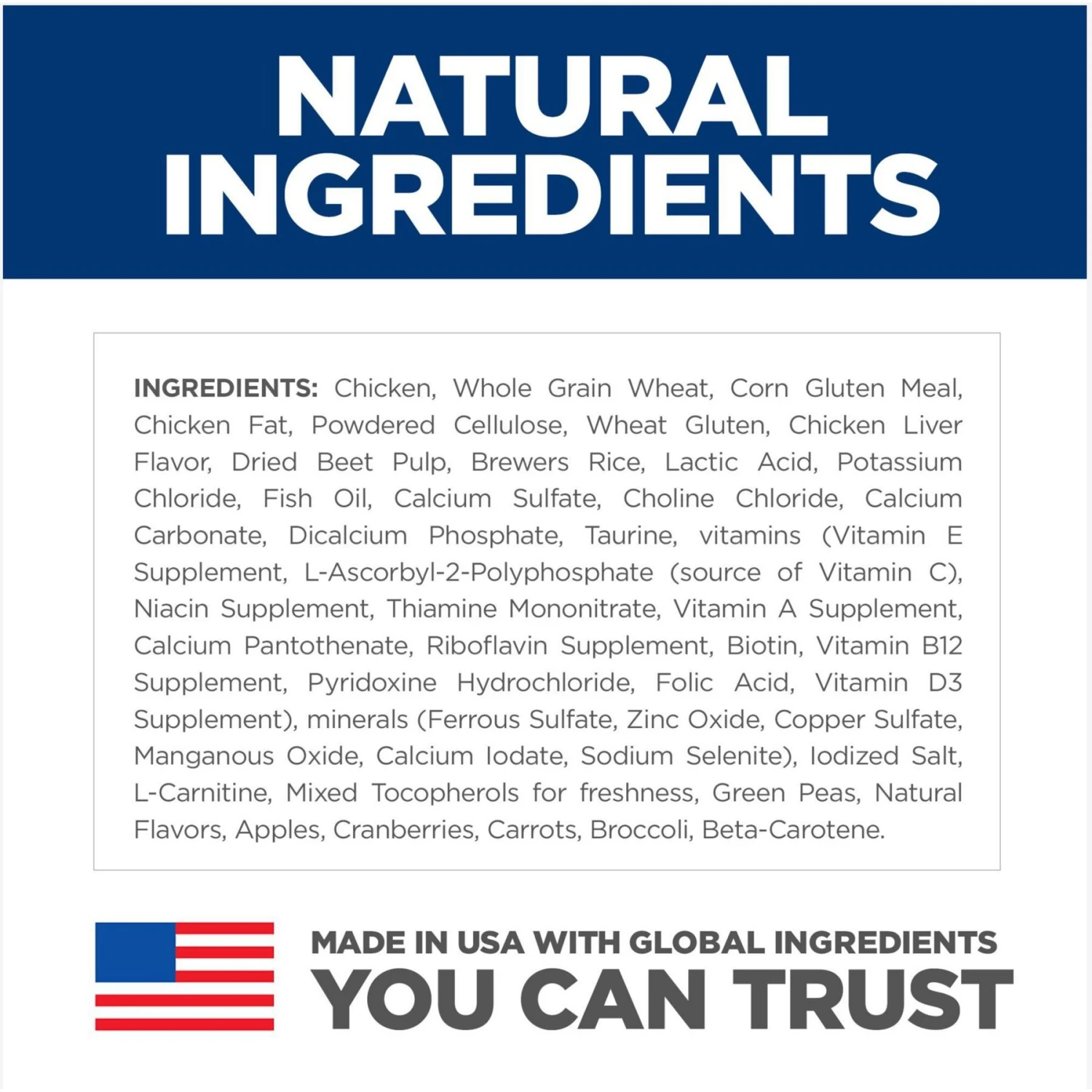 - Made in Hill’s U.S. facilities using high-quality ingredients and no artificial colors, flavors or preservatives.