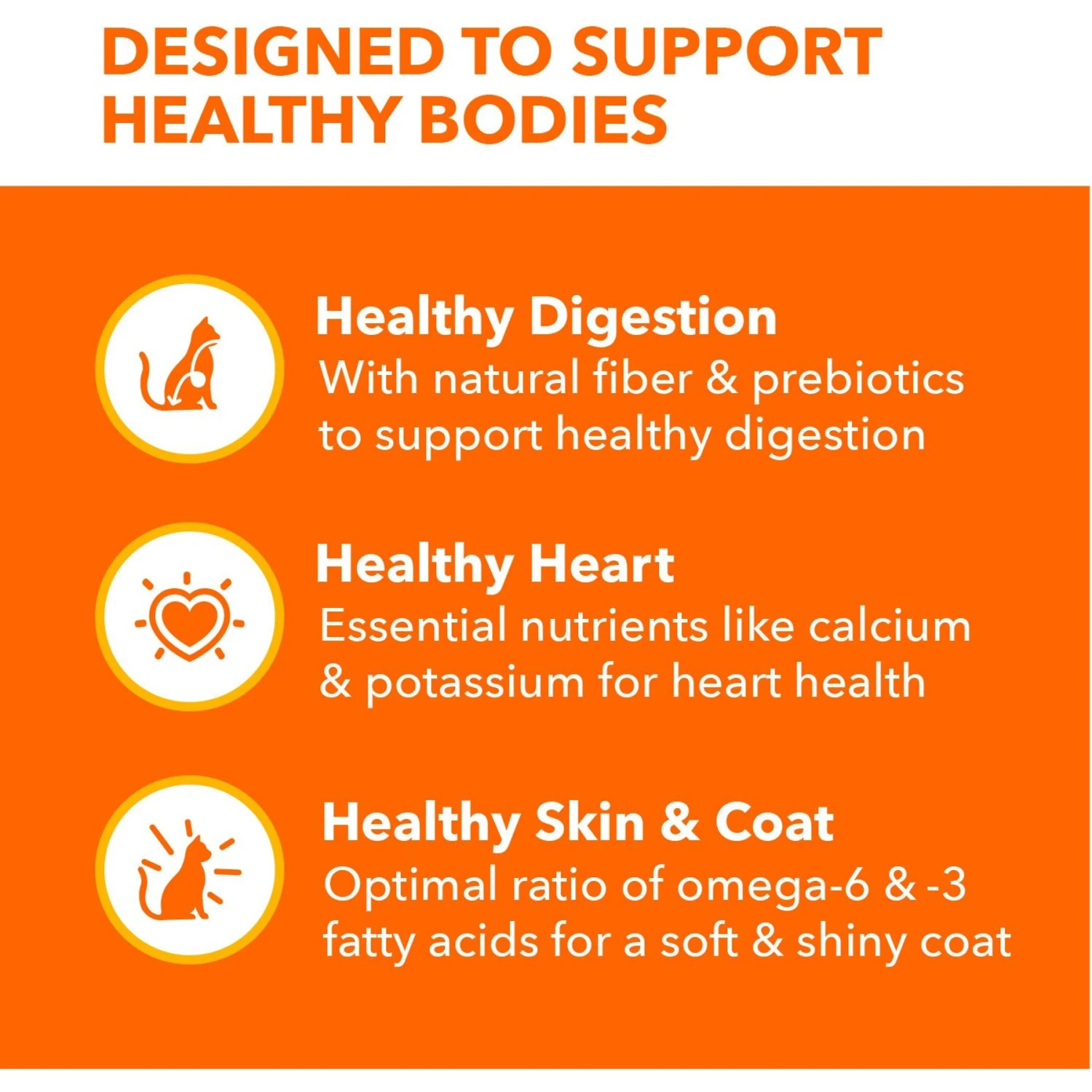 - Omega-3 and omega-6 fatty acids support healthy skin and a glossy coat.