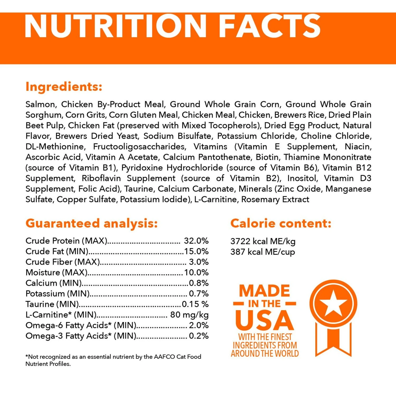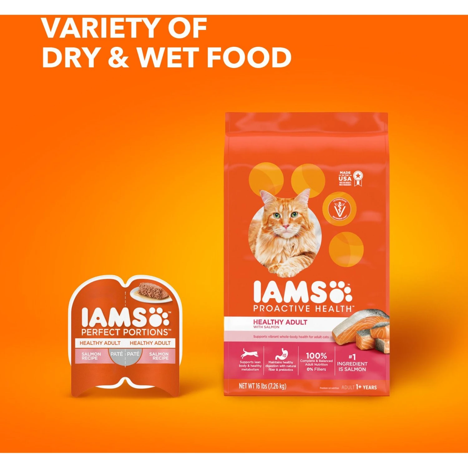 - Dry food for adult cats made with salmon as the first ingredient.