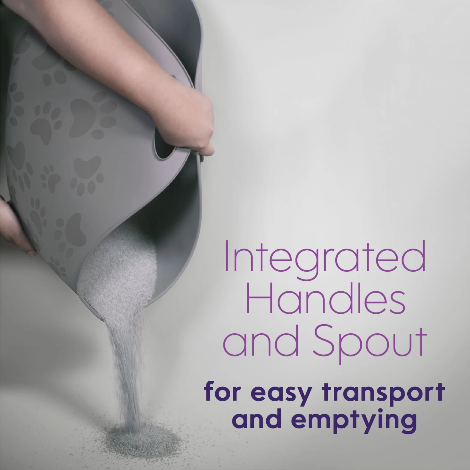 - The curved base, integrated spout and handles make it easy to transport and dispose of soiled litter.