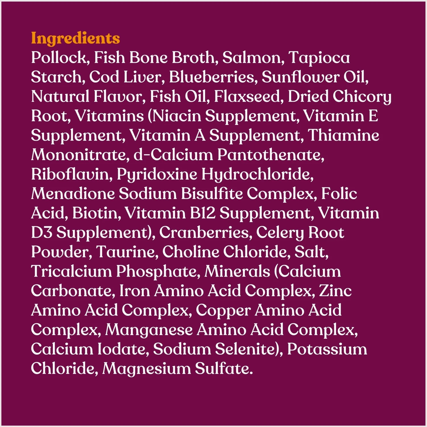 - First ingredient is premium, sustainably-caught pollock and salmon that are rich in essential fatty acids.