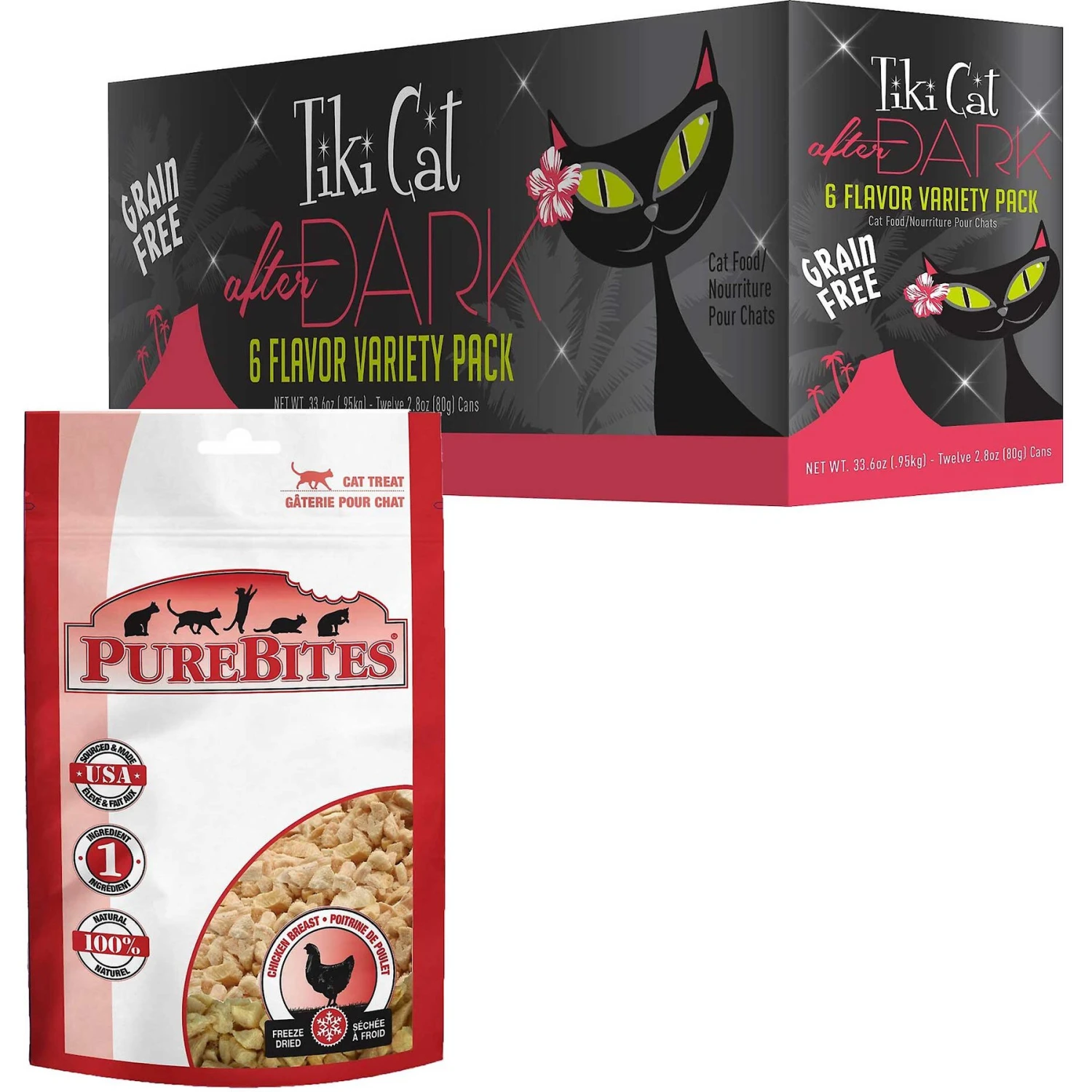 PureBites Chicken Breast Freeze-Dried Raw Cat Treats & Tiki Cat After Dark Variety Pack Canned Cat Food