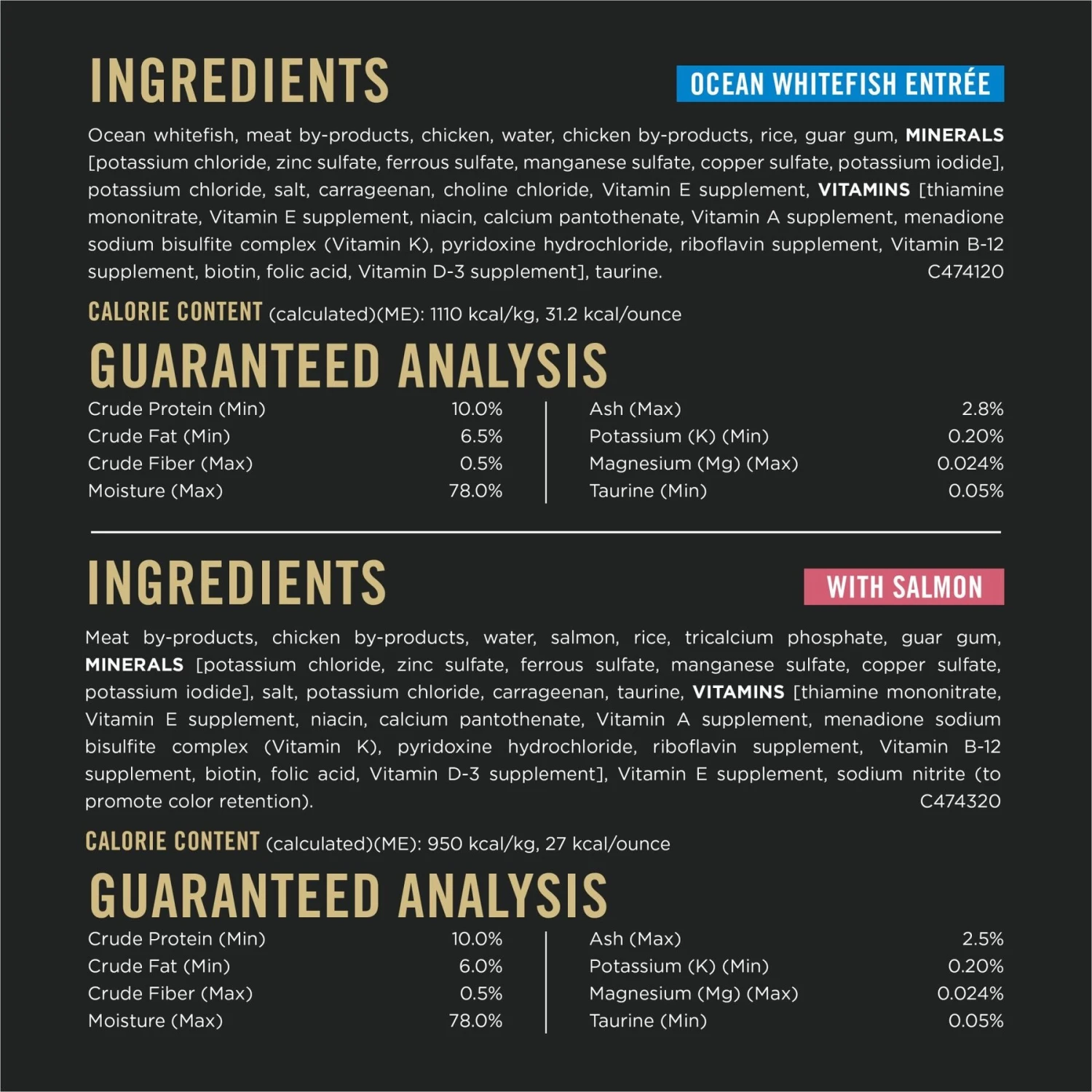 - Kitties choose from two tasty high protein wet cat food recipes—Classic Entree With Salmon and Ocean Whitefish Entree—both made with real fish for wholesome yum.