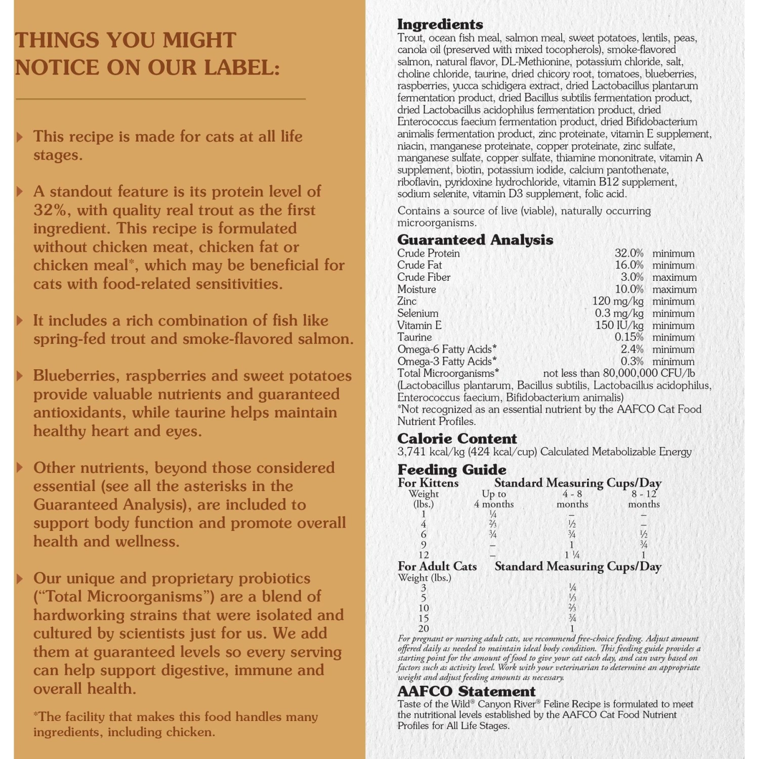 - This trout and smoke-flavored salmon dry cat food has a high protein content (32%) to help support bones, joints and a lean, healthy body condition. Fish is the only source of animal protein in this recipe, so it may be a good choice for furry sidekicks with food-related sensitivities.