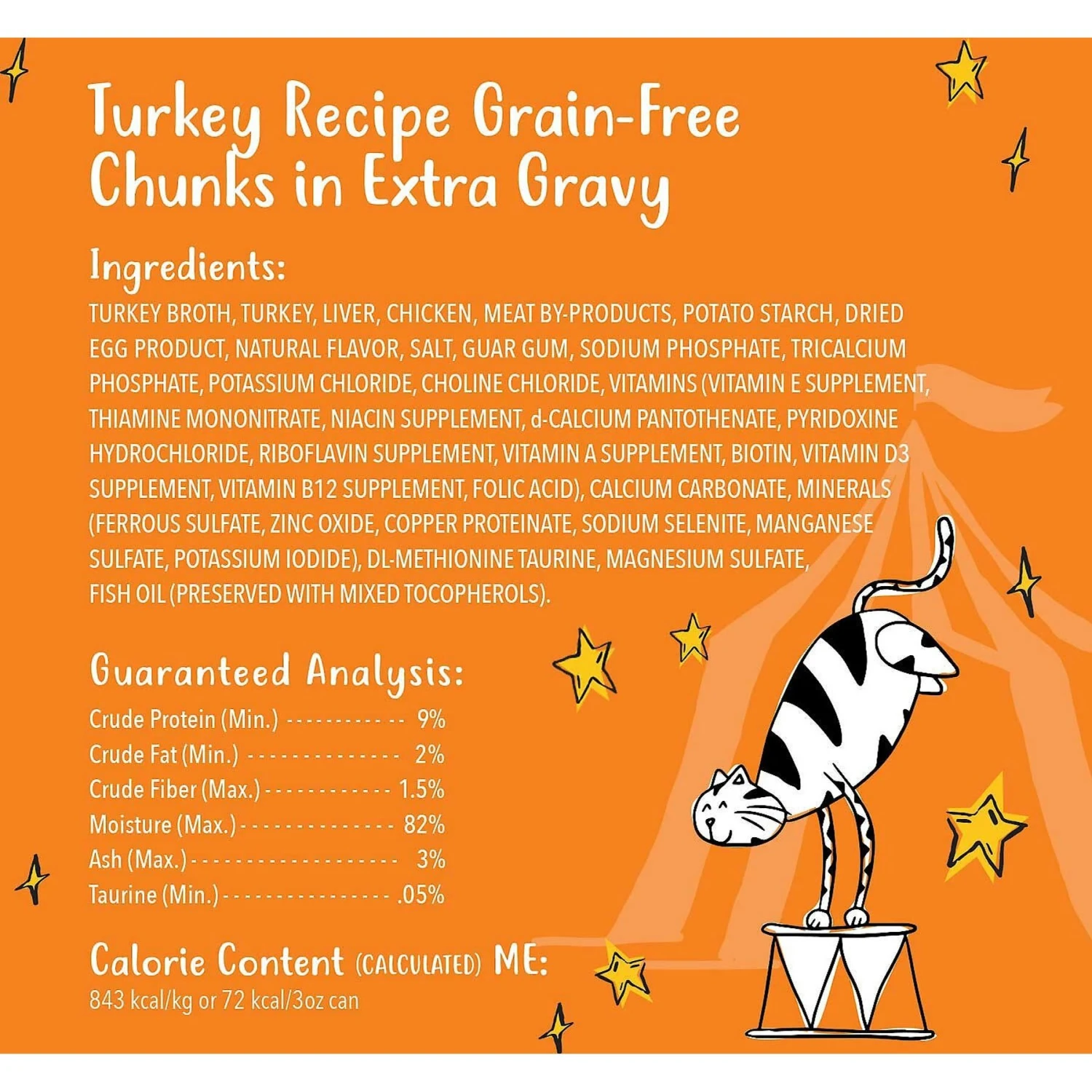 - Grain-free recipe with chunks of real turkey as the first ingredient for the protein and flavor cats crave.