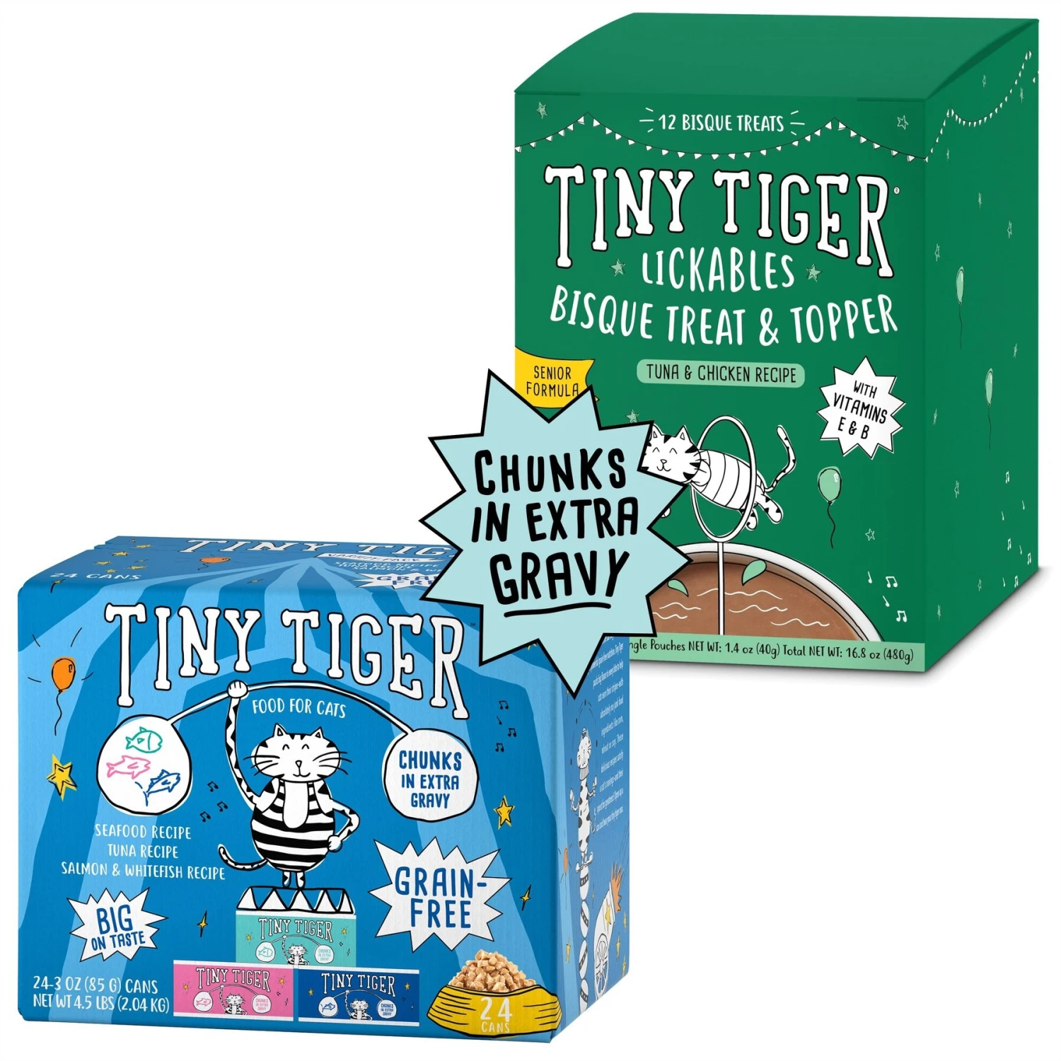 Tiny Tiger Chunks In EXTRA Gravy Seafood Recipes Variety Pack Grain-Free Canned Cat Food & Tiny Tiger Lickables, Senior Formula, Tuna & Chicken Recipe, Bisque Cat Treat & Topper