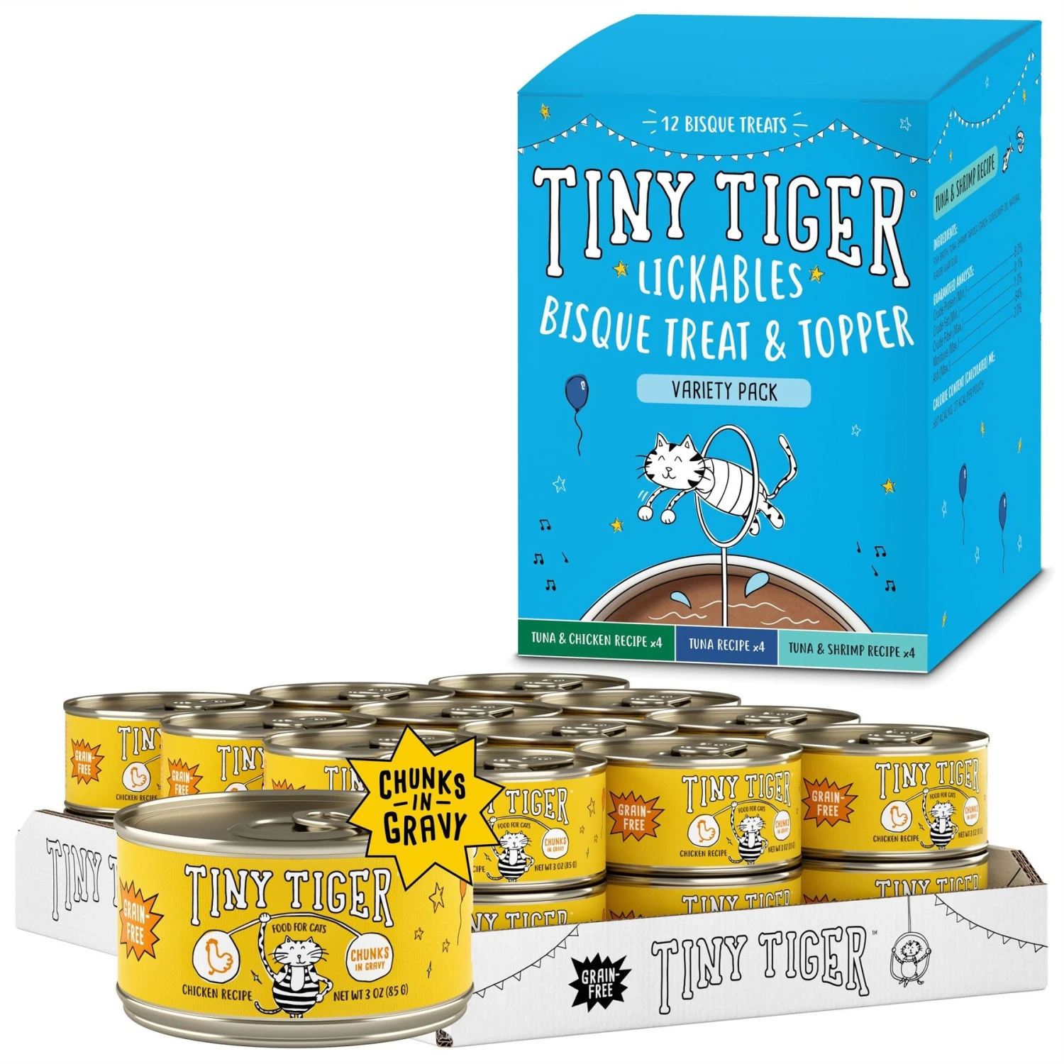 Tiny Tiger Chunks In Gravy Chicken Recipe Grain-Free Canned Cat Food & Tiny Tiger, Lickables, Variety Pack, Bisque Cat Treat & Topper