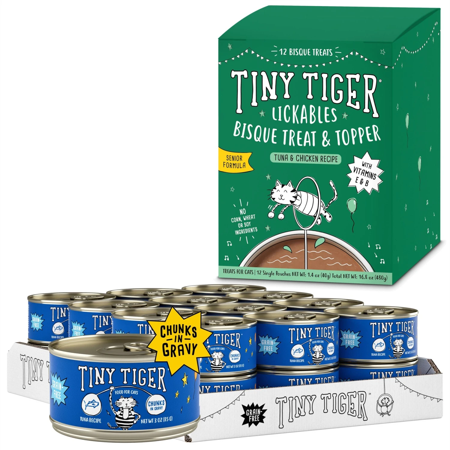 Tiny Tiger Chunks In Gravy Tuna Recipe Grain-Free Canned Cat Food & Tiny Tiger Lickables, Senior Formula, Tuna & Chicken Recipe, Bisque Cat Treat & Topper