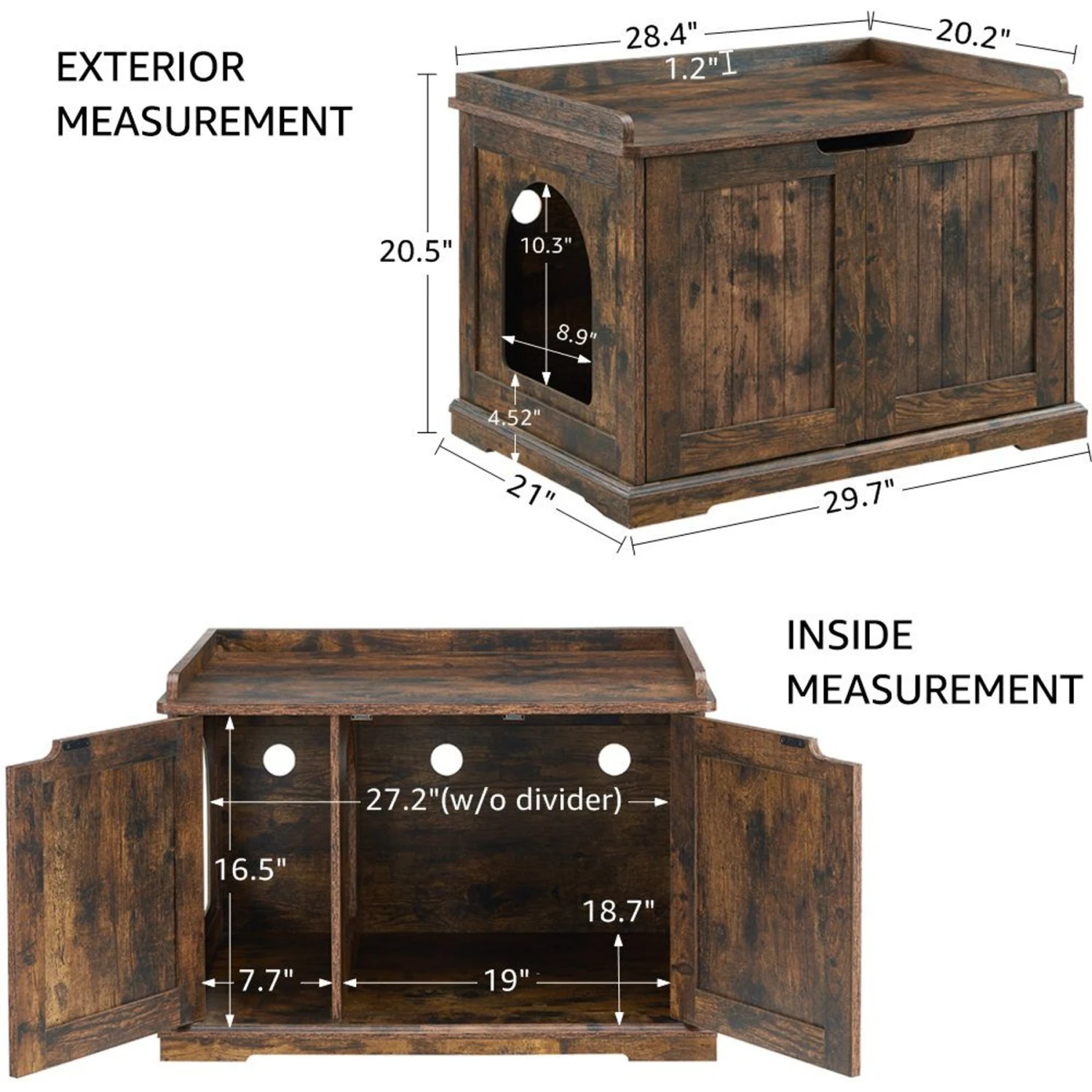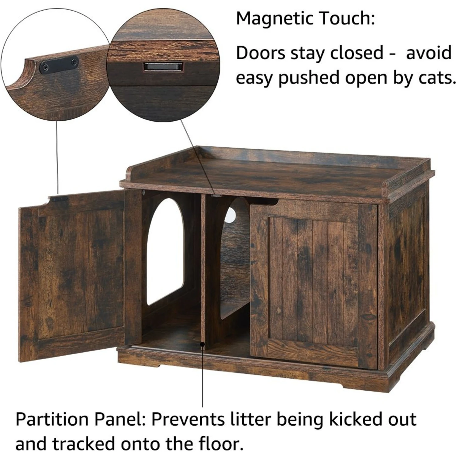 - Interior partition panel prevents litter from being kicked out and can be removed to create a big space for a larger litter pan.