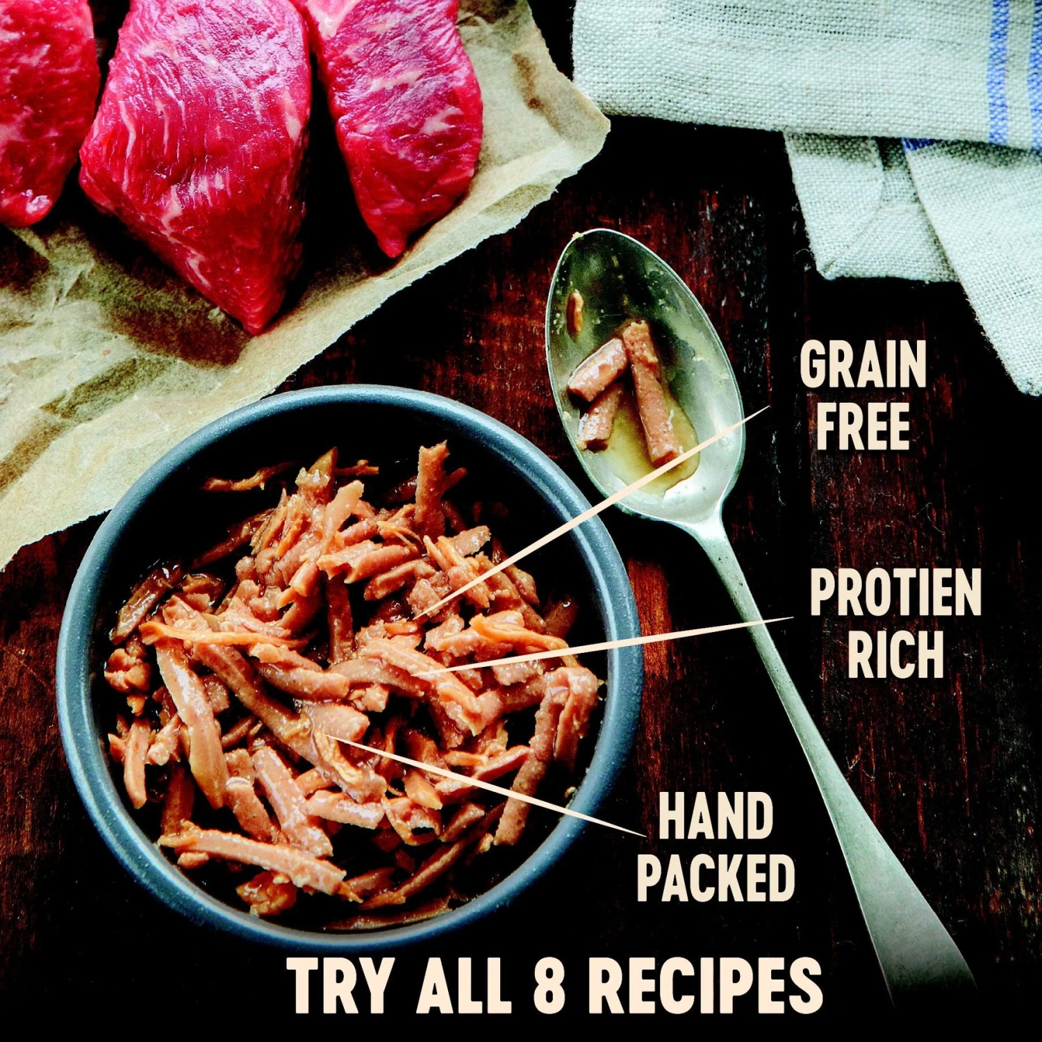 - Hand-packed with shreds of real chicken, turkey or beef in a savory sauce.