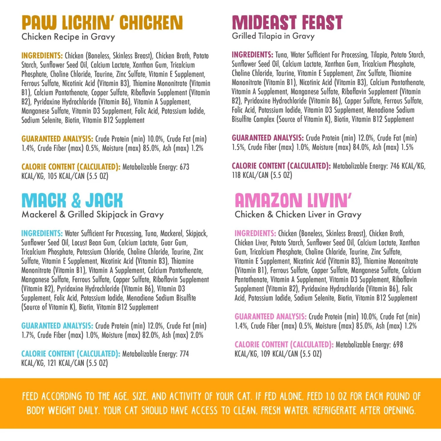 | Flavor | Green Eggs & Chicken, The 10 Ounce Pounce Pack, Chicken Gone Fishin' Pack, Polynesian BBQ, Mack and Jack, Amazon Livin, Meow Luau, Asian Fusion, Holy Chicken Mackerel Pack, Marbella Paella, Grandma's Chicken Soup, Mideast Feast, Paw Lickin' Pals Pack, Paw Lickin' Chicken, Frisky Fishin' Friends Pack, Funky Chunky Chicken Soup, Outback Grill |