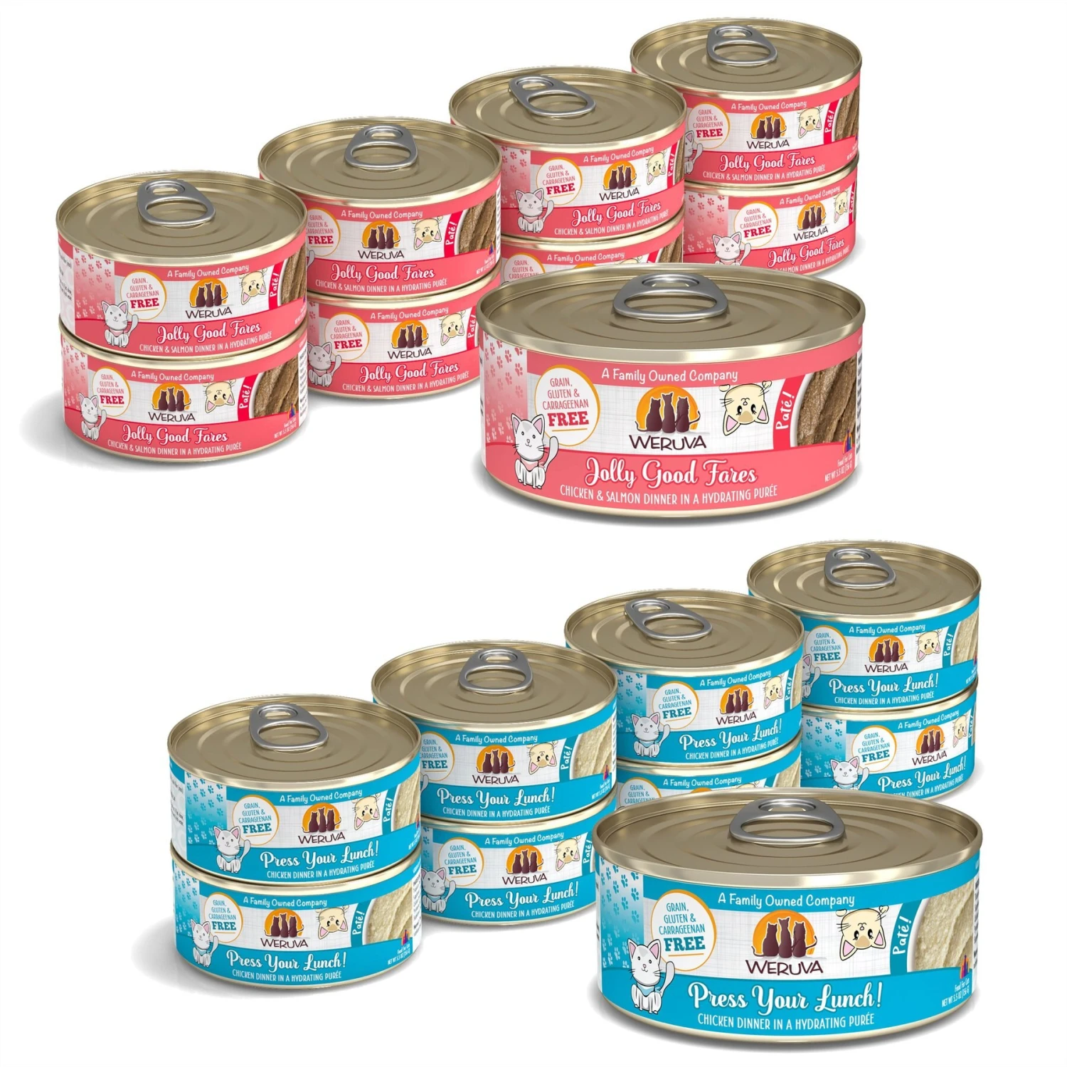 Weruva Classic Cat Jolly Good Fares Chicken & Salmon Pate Canned Cat Food, 5.5-oz can, case of 8—Weruva’s Classic Cat Jolly Good Fares Chicken & Salmon Pate will leave her feline jolly good and cat-isfied all day long. This chicken and salmon recipe is pureed into a paw-fect, silky pate that’s sure to im-purr-ess her taste buds. You’ll feel good about how you’re nourishing her with the simple wholesome ingredients that you can actually see in the food! Not only is it grain-free, but it’s also made without those not-so-desirable ingredients like gluten, carrageenan and artificial flavors and colors. It will leave your furbaby feline good with the high moisture content that meets her needs. Plus, there are a variety of flavor options with Weruva so you can help kitty find her fur-avorite.