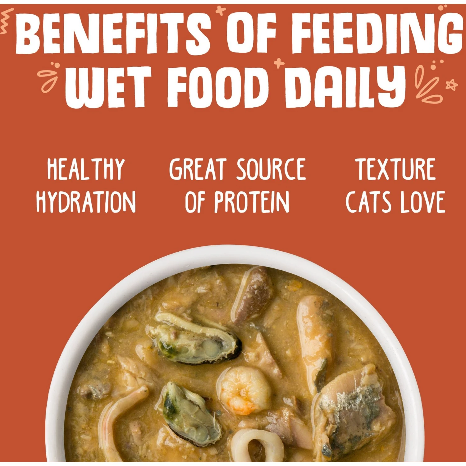- Grain-free wet food is made with mackerel, shrimp and mussels as the top ingredients so it’s high in protein sourced from real meat.